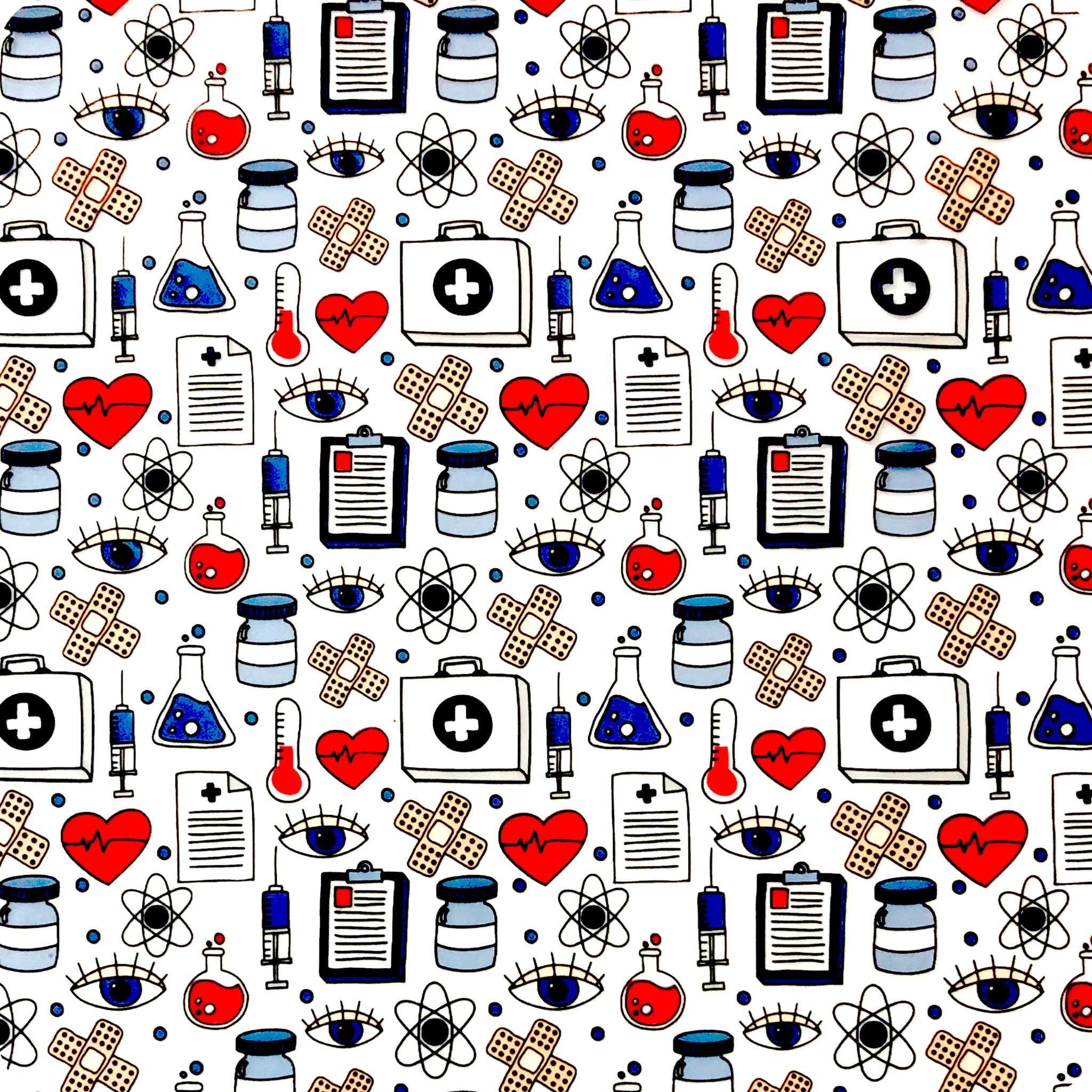 Lámina de hidroimpresión con diseño del sector de la sanidad, con jeringuillas, corazones, tiritas, botiquines, etc. Diseño en varios colores, predominando el rojo y azul. Fondo transparente.